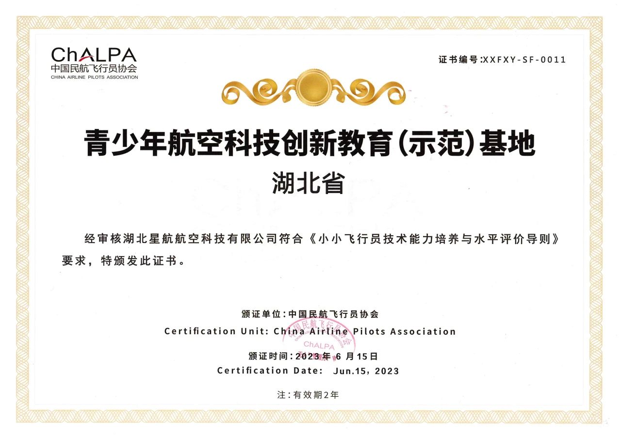 6月15日,經中國民航飛行員協會(CHALPA)審核,湖北星航航空科技有限公司符合《小小飛行員技術能力培養與水平評價導則》要求,被認定為湖北省青少年航空科技創新教育(示范)基地。這也是湖北省首家獲此殊榮的基地。